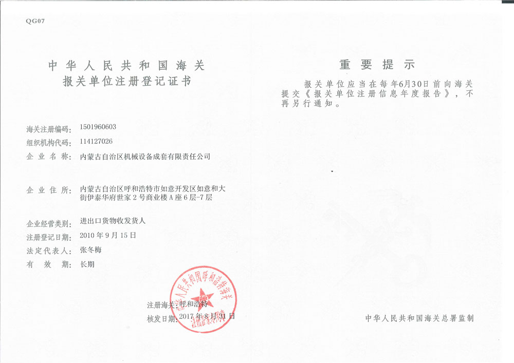 海關報關單位注冊登記證書